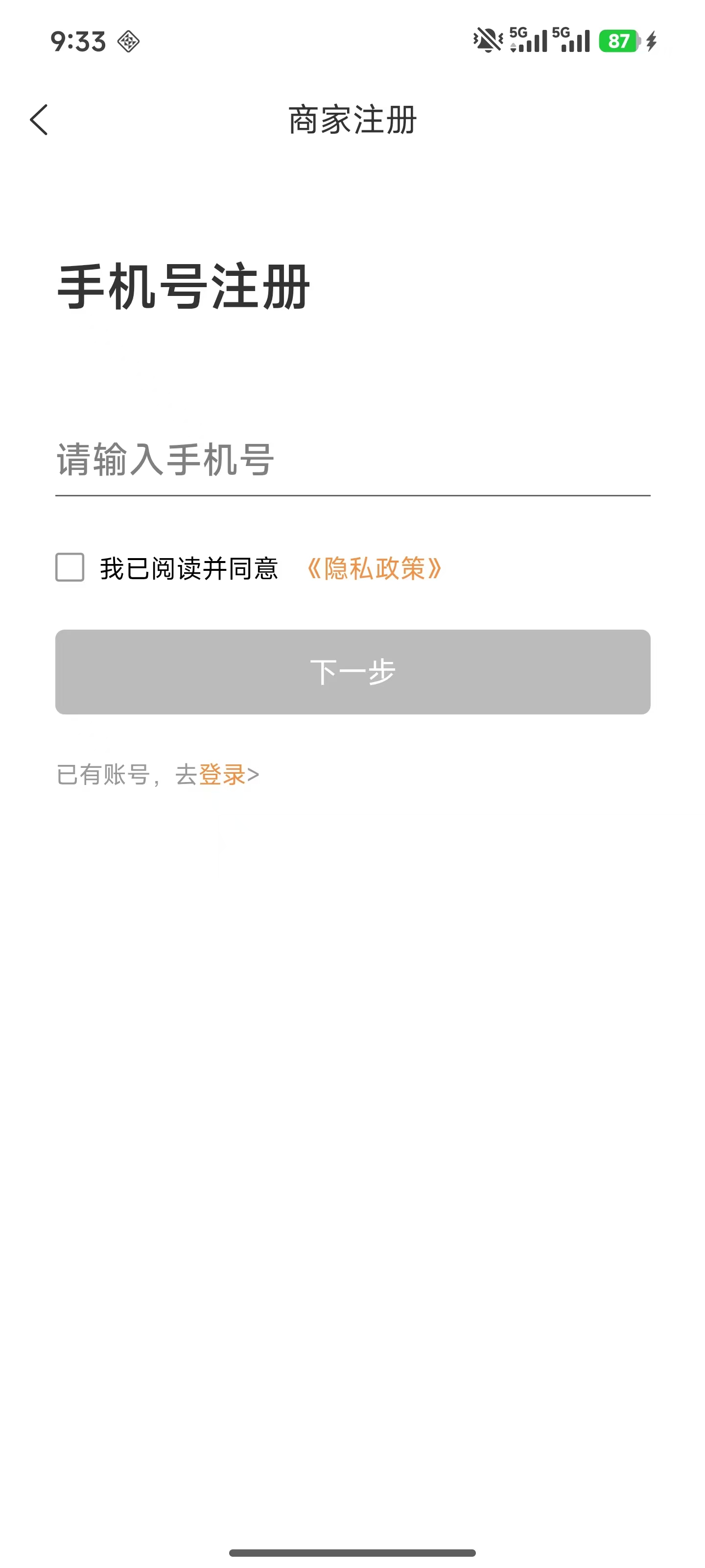 商家打开 APP 后,首先需要使用手机号注册账号。- 输入 11 位手机号