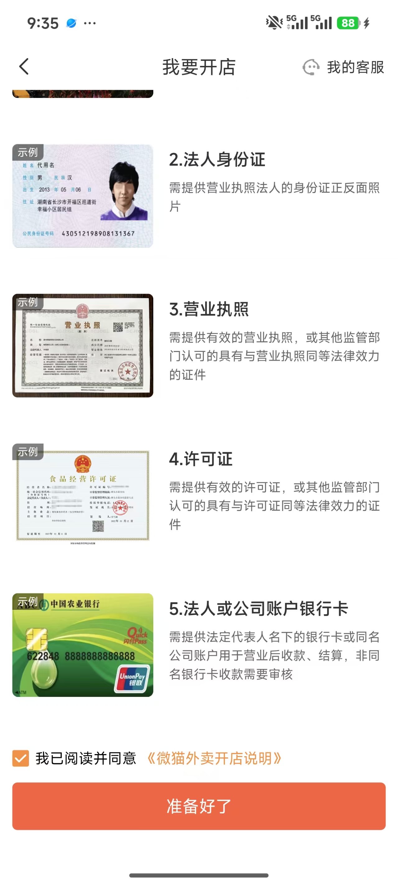 注册完成后,商家进入「我要开店」引导页,展示开店需要准备的 5 项资料:| 序号 | 资料 | 说明 |