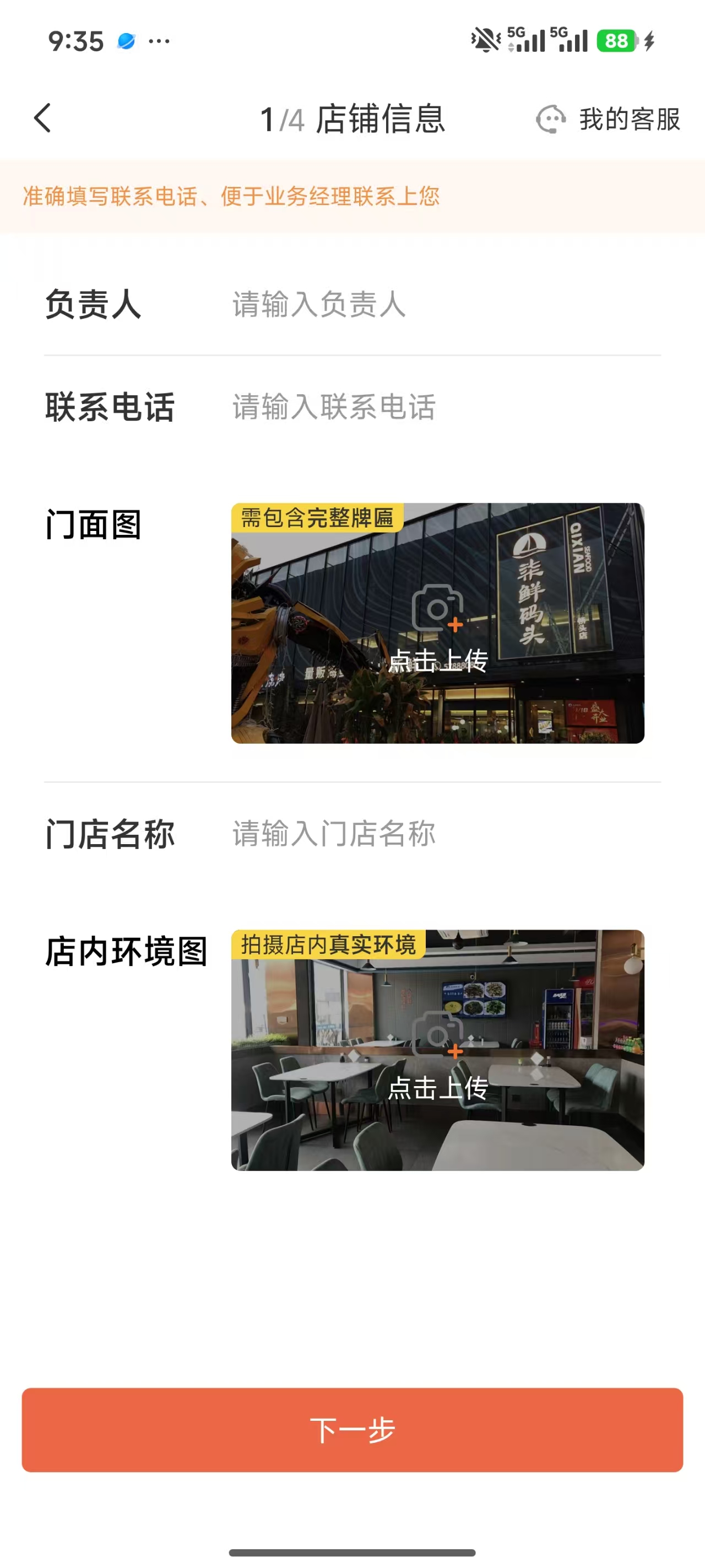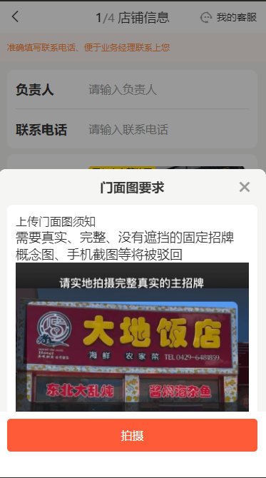 这一步商家需要填写店铺的基本信息并上传门面照片:| 字段 | 说明 | 必填 |