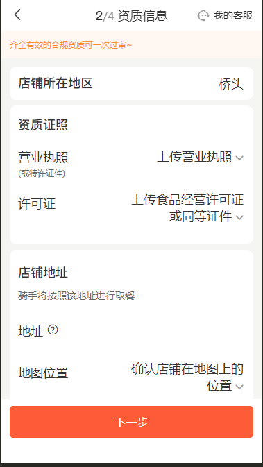 这一步商家需要上传资质证照并确认店铺地址: 资质证照:| 项目 | 说明 |