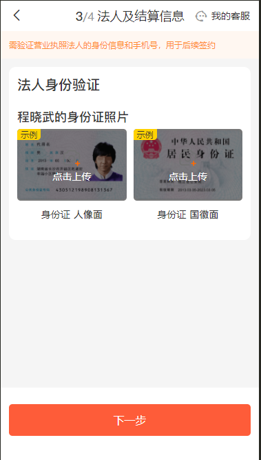 这是信息量最大的一步,需要验证法人身份并填写结算账户。 法人身份验证:- 上传法人 身份证人像面(需先阅读拍摄示例,完成滚动后才能拍摄)