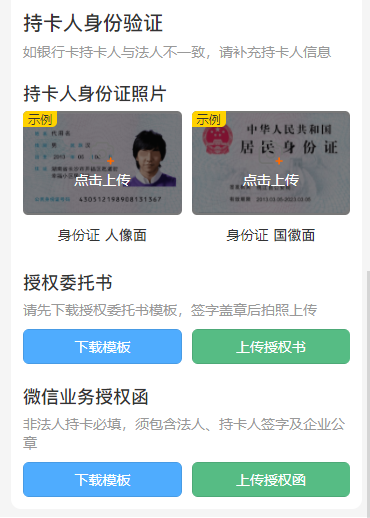 如银行卡持卡人与法人不一致,系统会自动检测并显示「持卡人身份验证」区域,需额外上传: