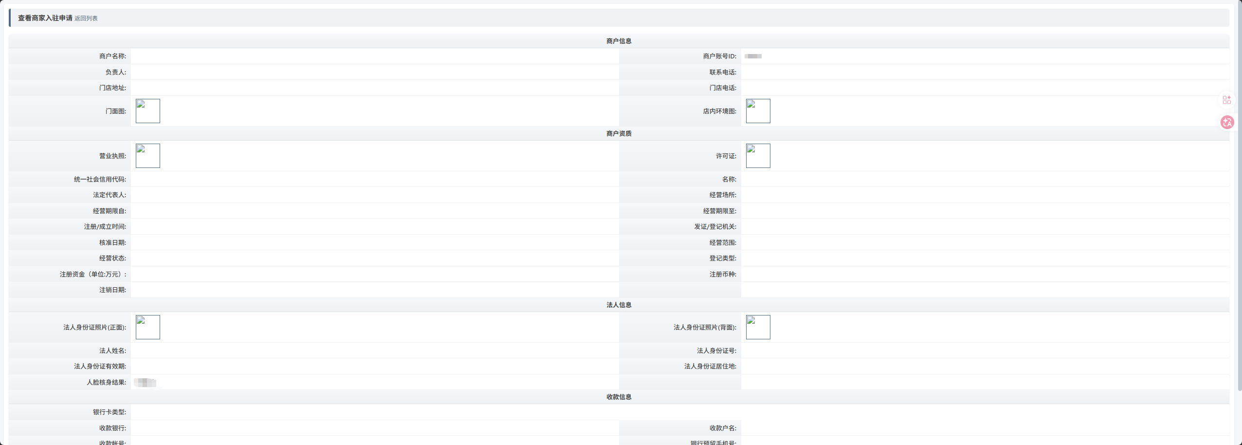 点击操作列的 「查看」 进入详情页,逐一检查商家提交的所有资料: