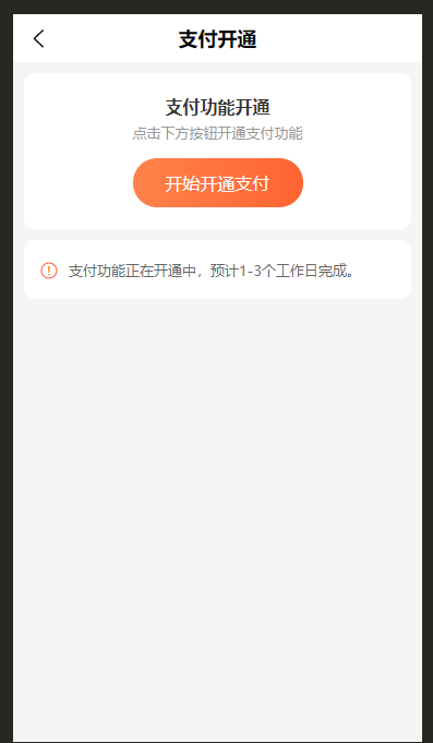审核通过后,商家在 APP 中进入「支付功能开通」页面:- 首次进入:页面显示 「开始开通支付」 按钮