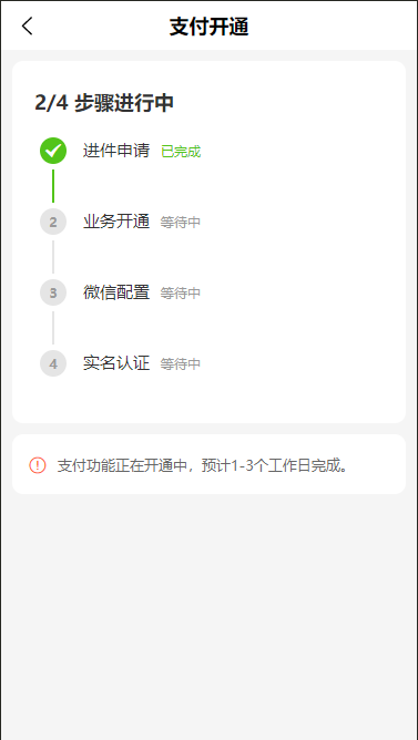 | 阶段 2 | 业务开通 | 自动(后台定时任务) | 审核通过后,自动激活微信支付等支付场景 |