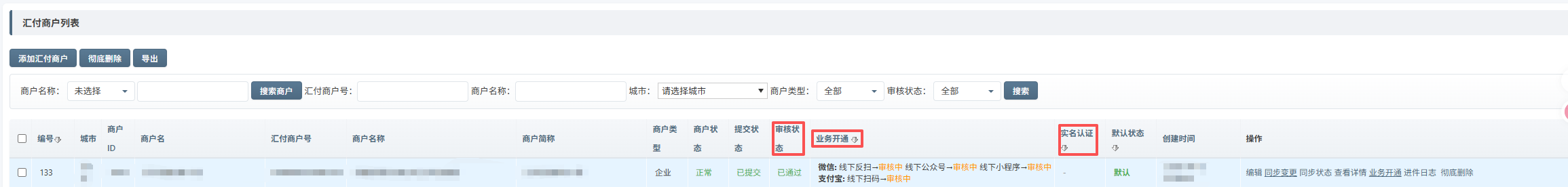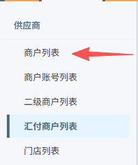 在管理后台左侧菜单中找到 商家管理 → 汇付商户管理。 列表页关键状态列:| 列名 | 含义 |