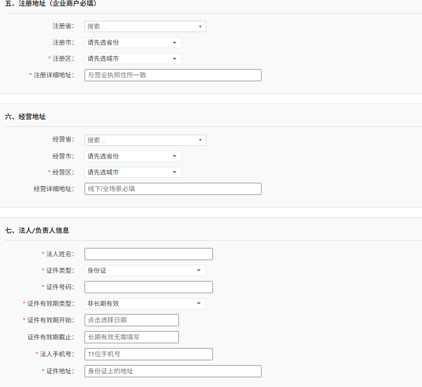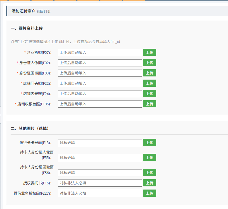 | ④ | 上传证照 | 将营业执照、身份证、门头照、银行卡等图片上传到支付渠道服务器 |