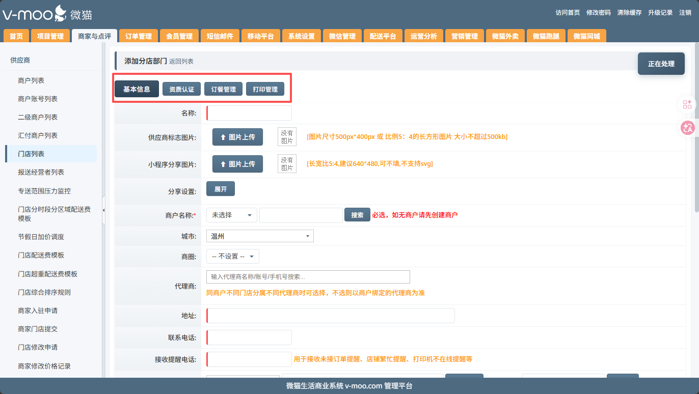 商家入驻审核通过后,系统会自动为商家创建一个草稿门店。此时门店尚未上线,运营人员需要在管理后台完成门店的核心配置,才能使门店正式上线营业。本文档面向运营人员,按照门店编辑页面的 5 个功能选项卡 逐项说明每项配置的用途和操作要点。