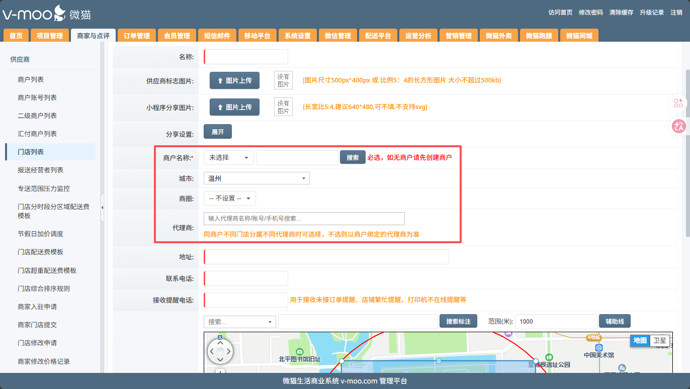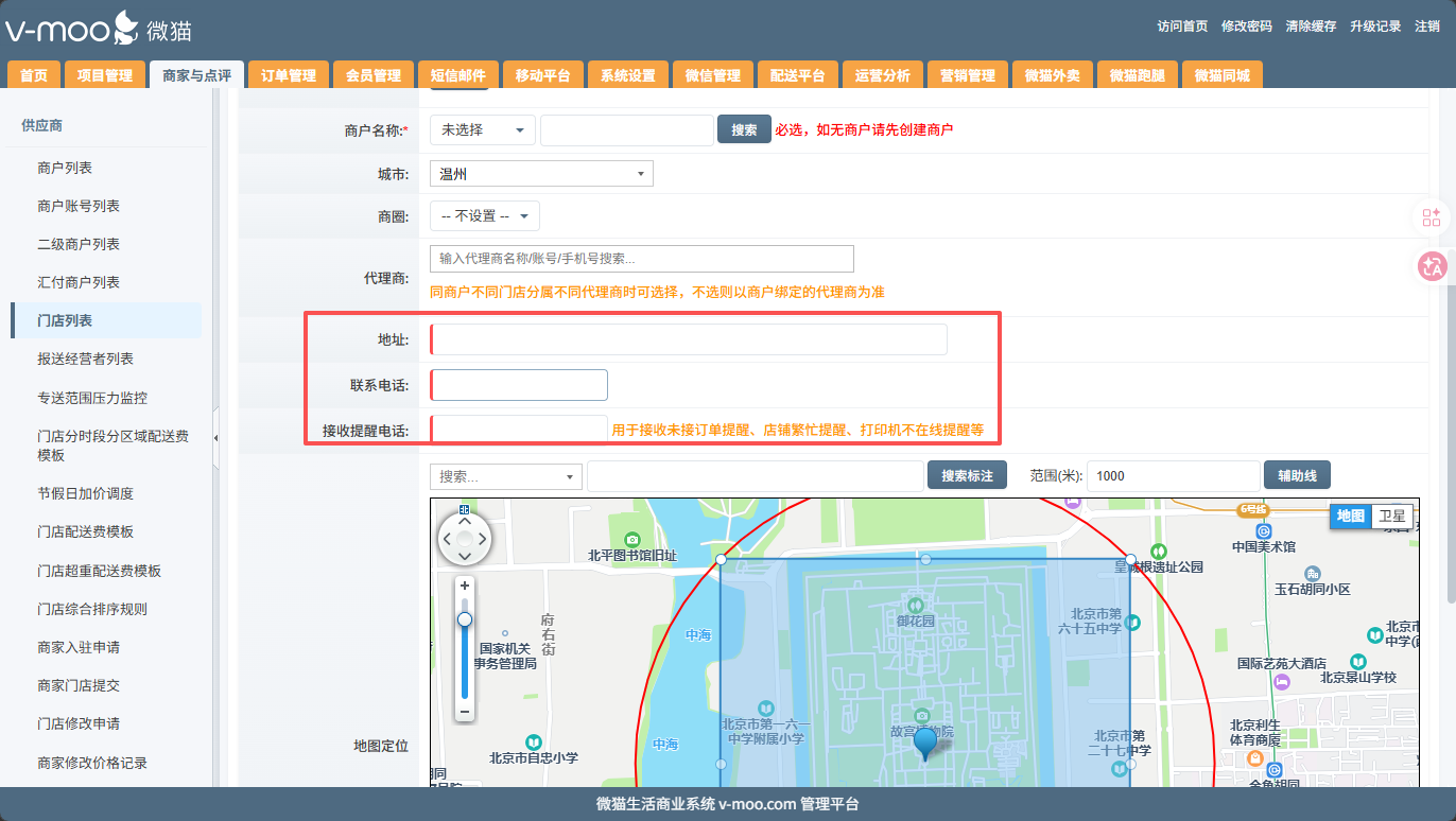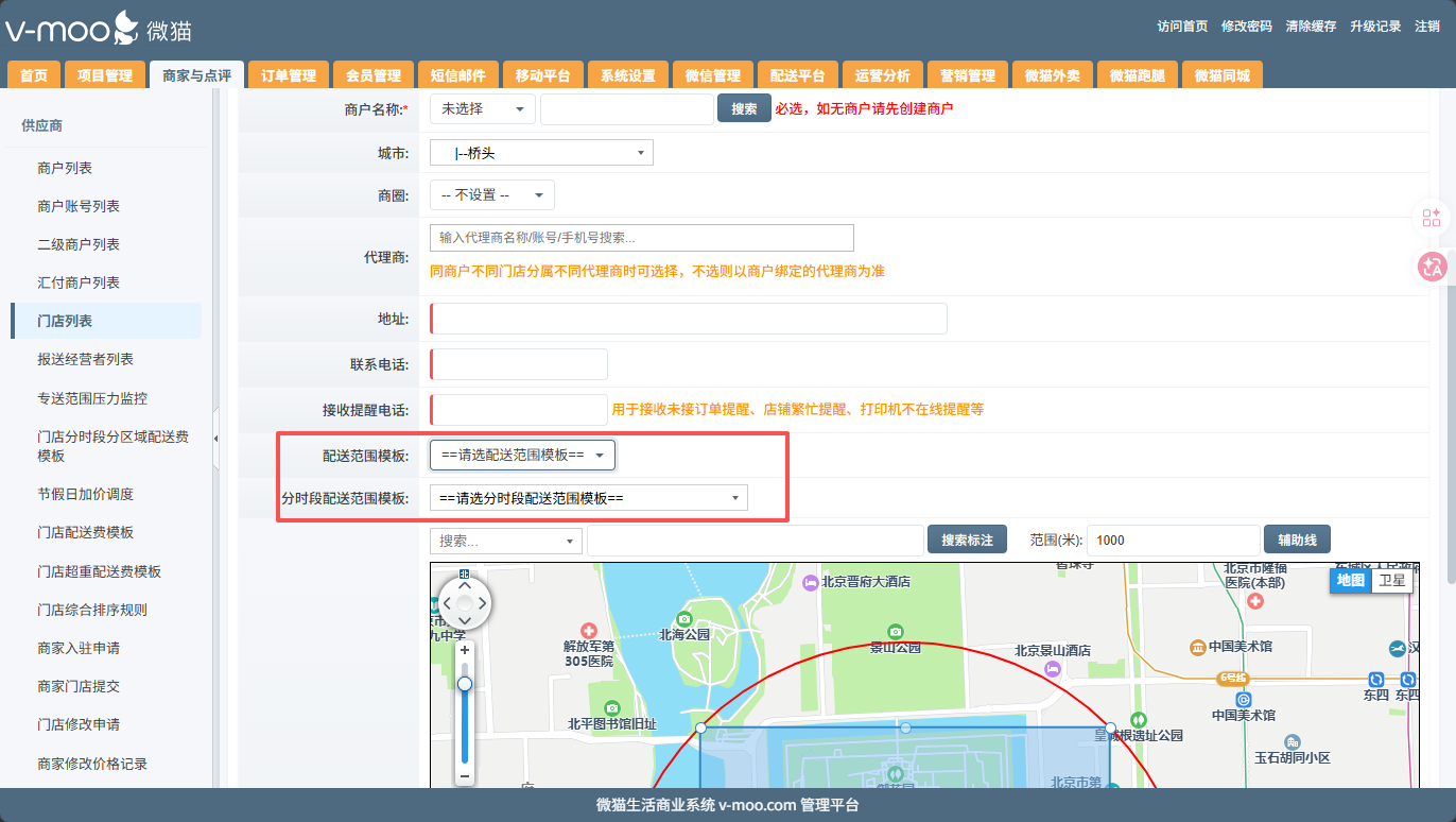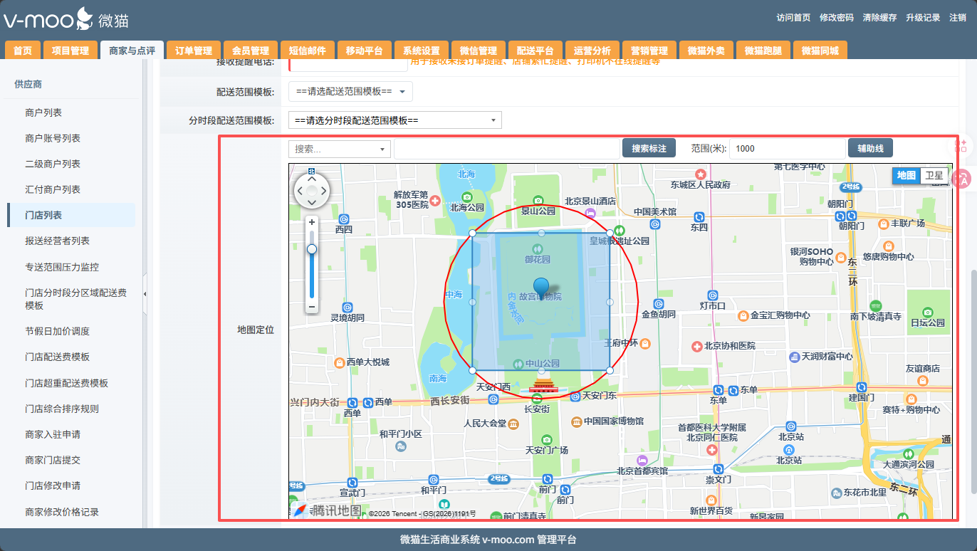 操作步骤:- 在省/市/区下拉框中选择门店所在区域(辅助定位)