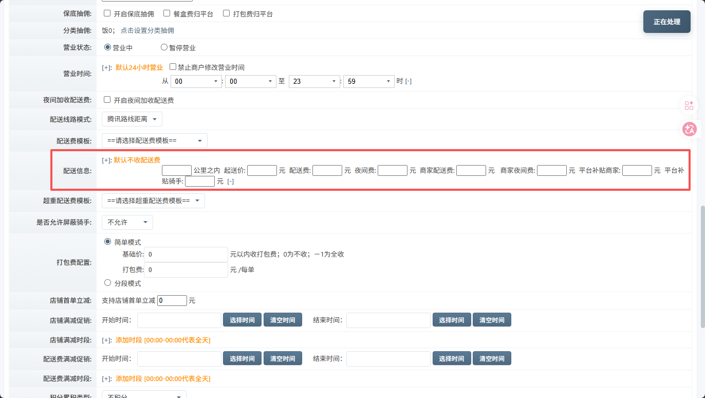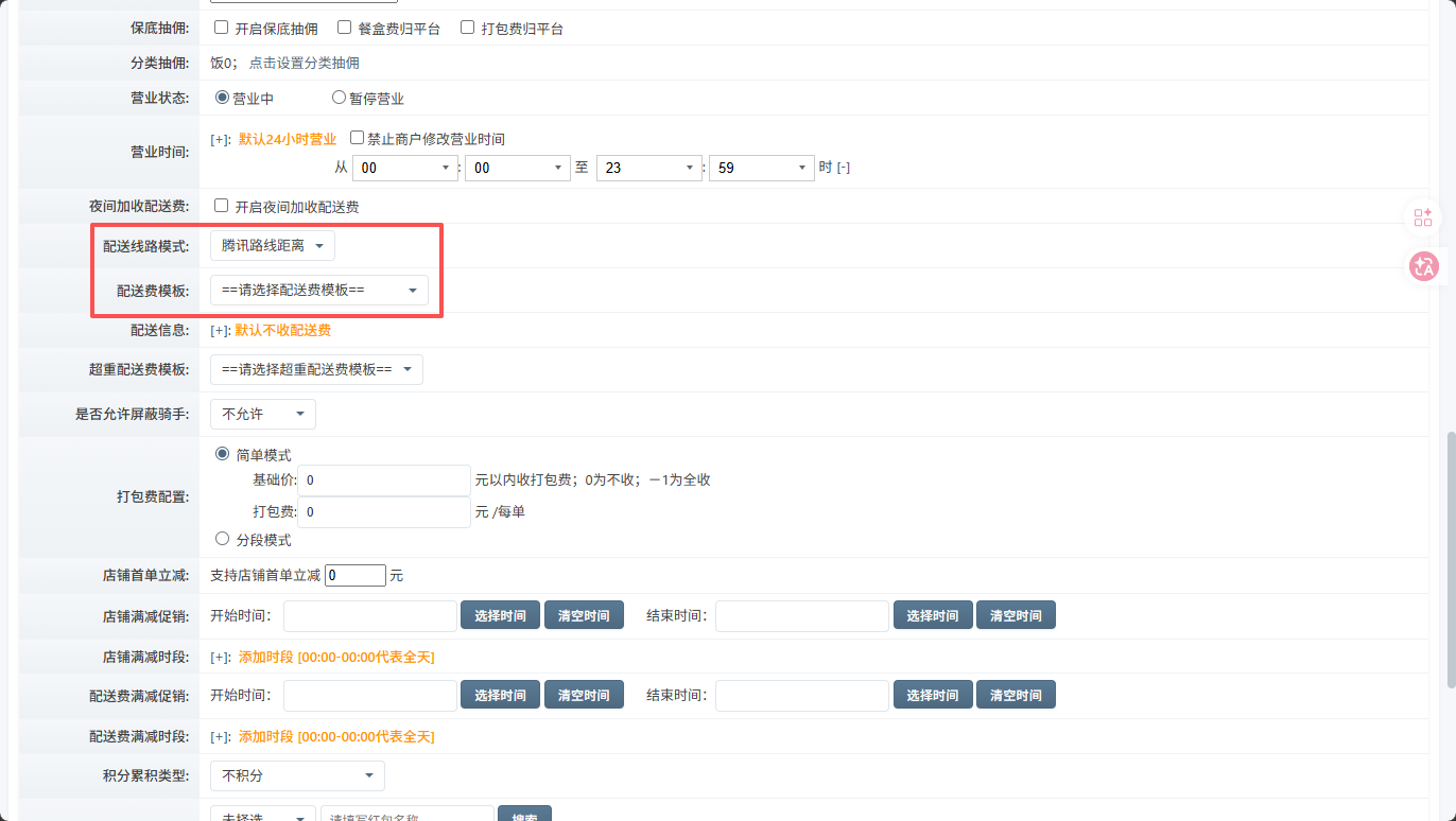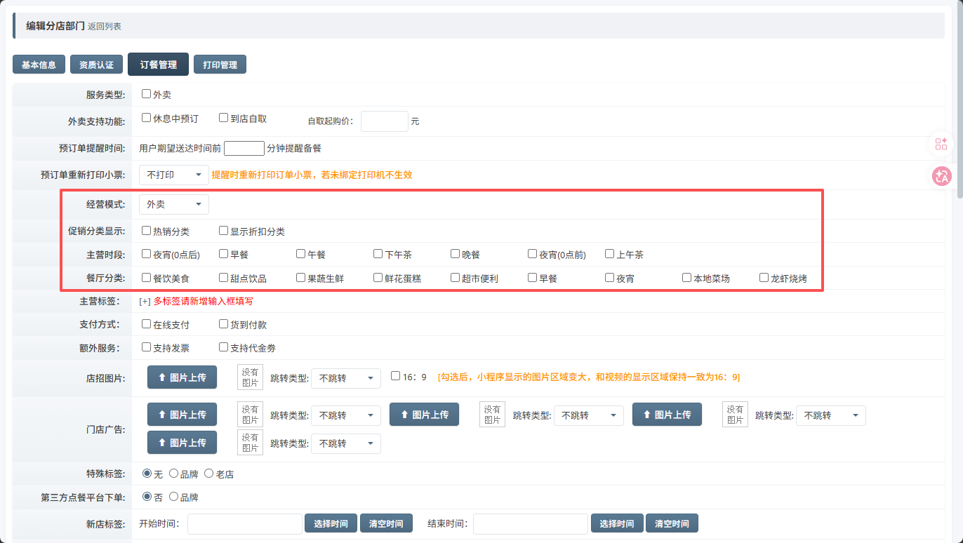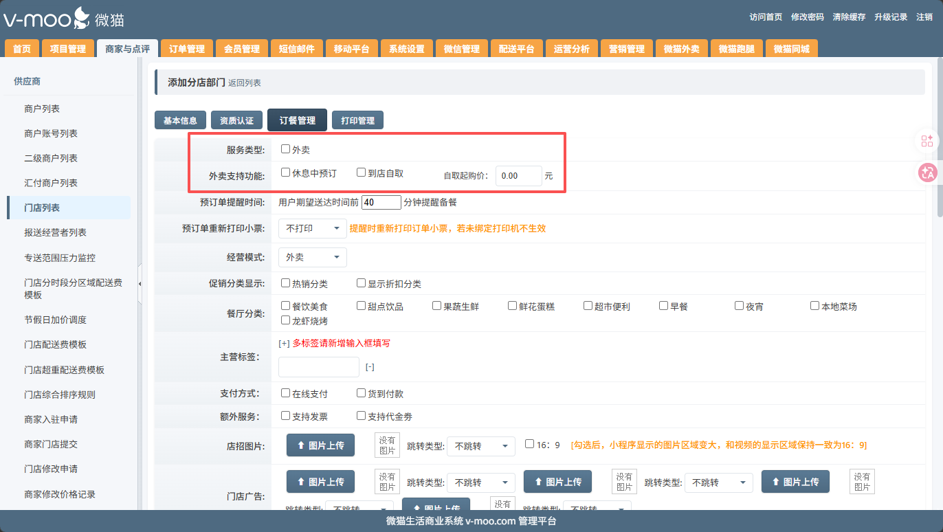 | 外卖管理 | 服务类型、配送、佣金、营业时间 | ⭐⭐⭐ 必配(最核心) |