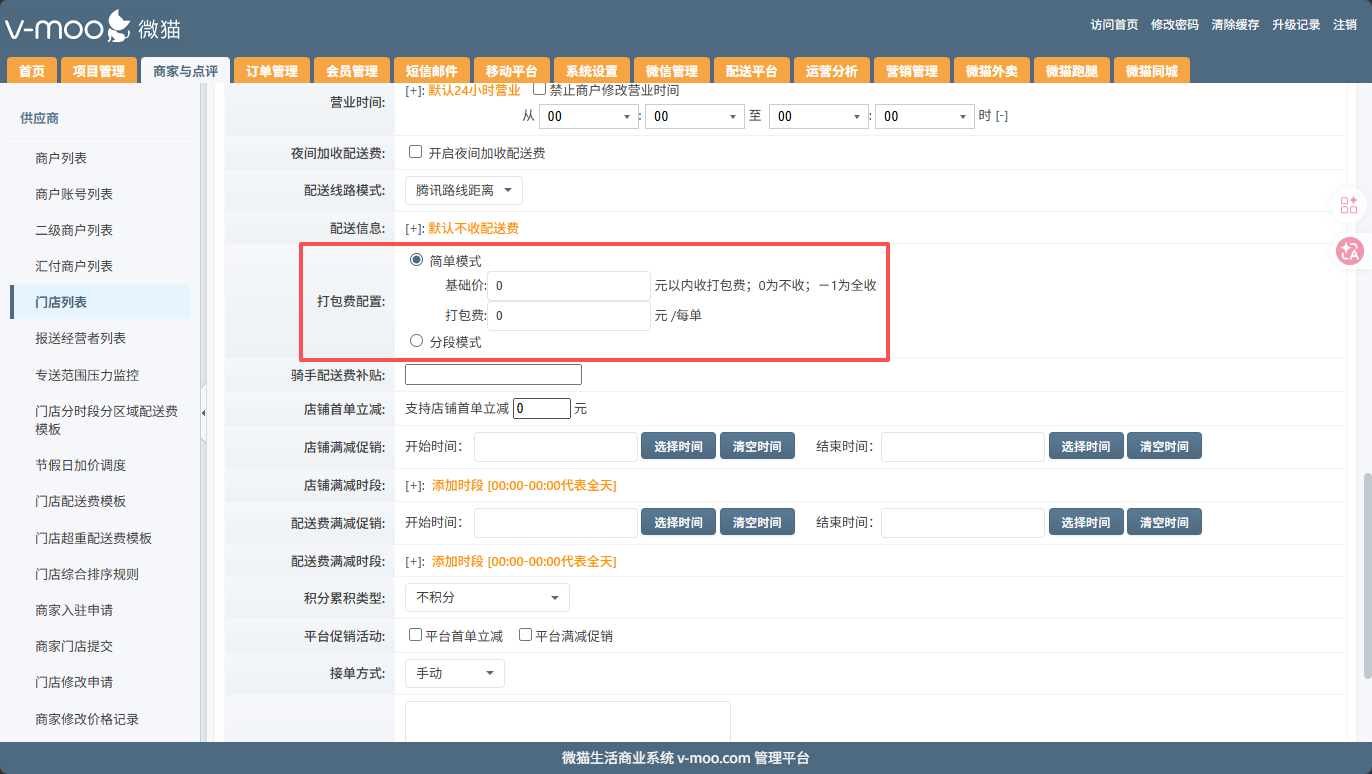 - 基础价:用户消费金额在此金额以内时收取打包费